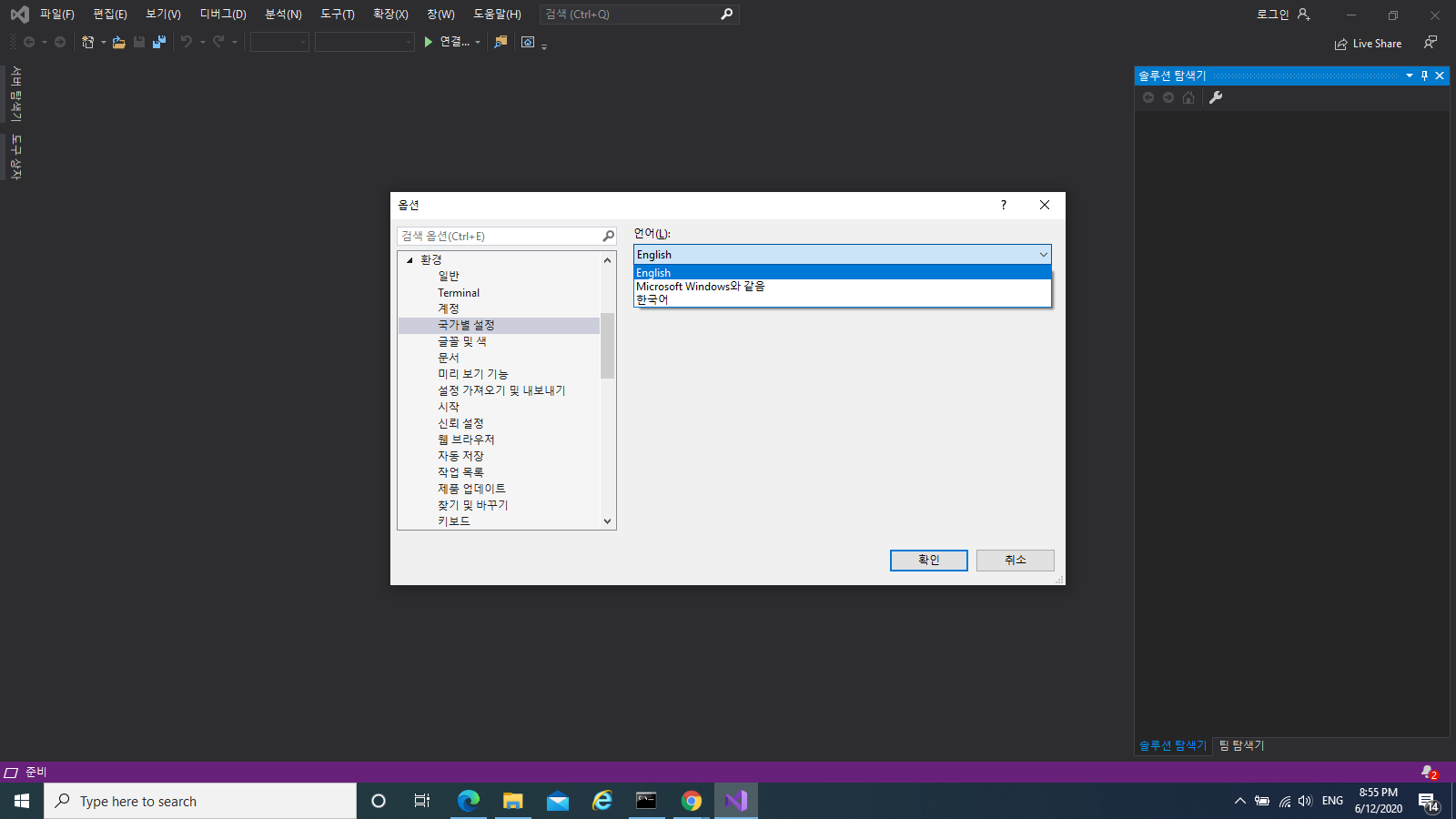 - Visual Studio와 Windows 10 SDK 설치후, Visual Studio 언어설정을 무조건 영어(English)로 설정하기