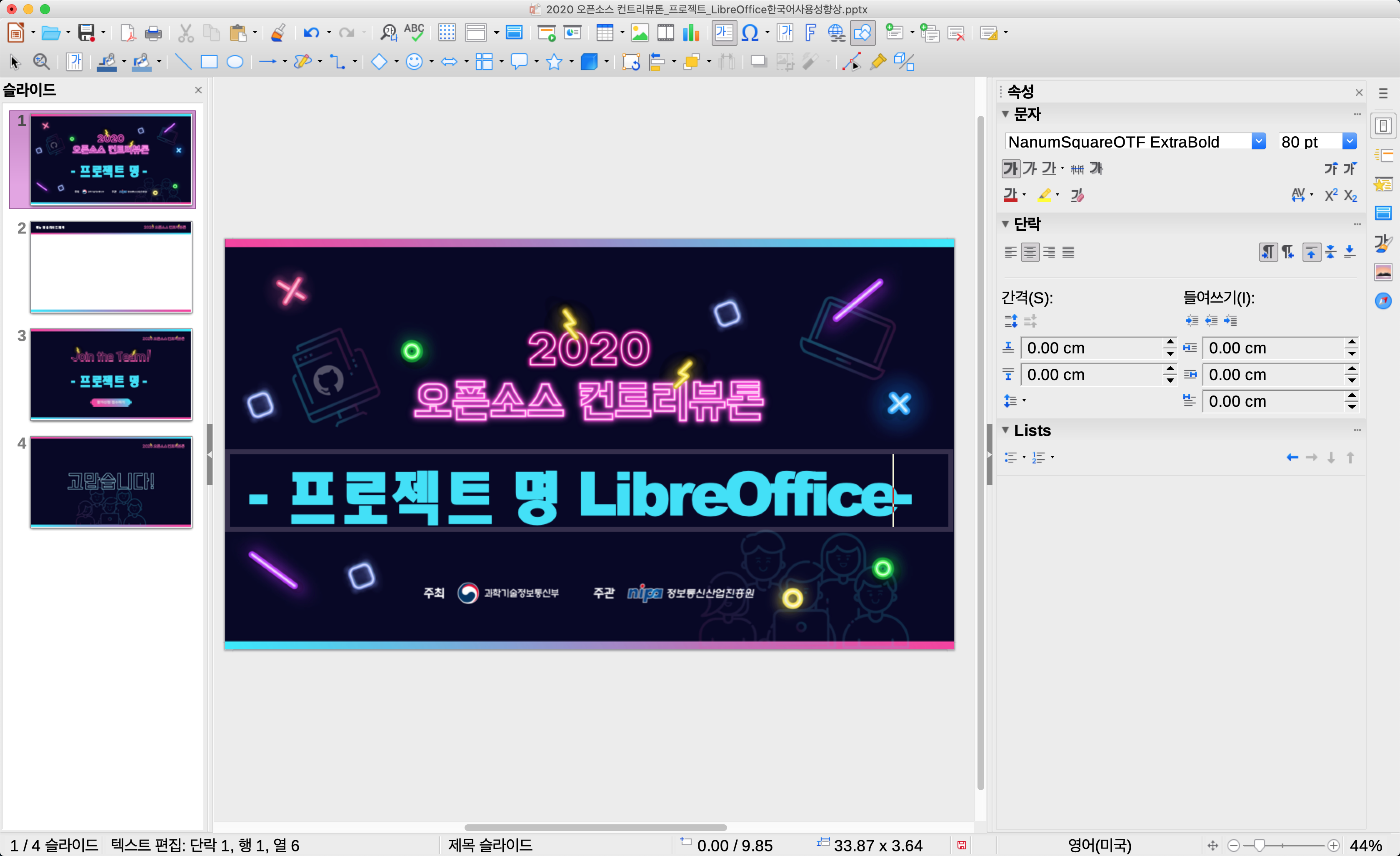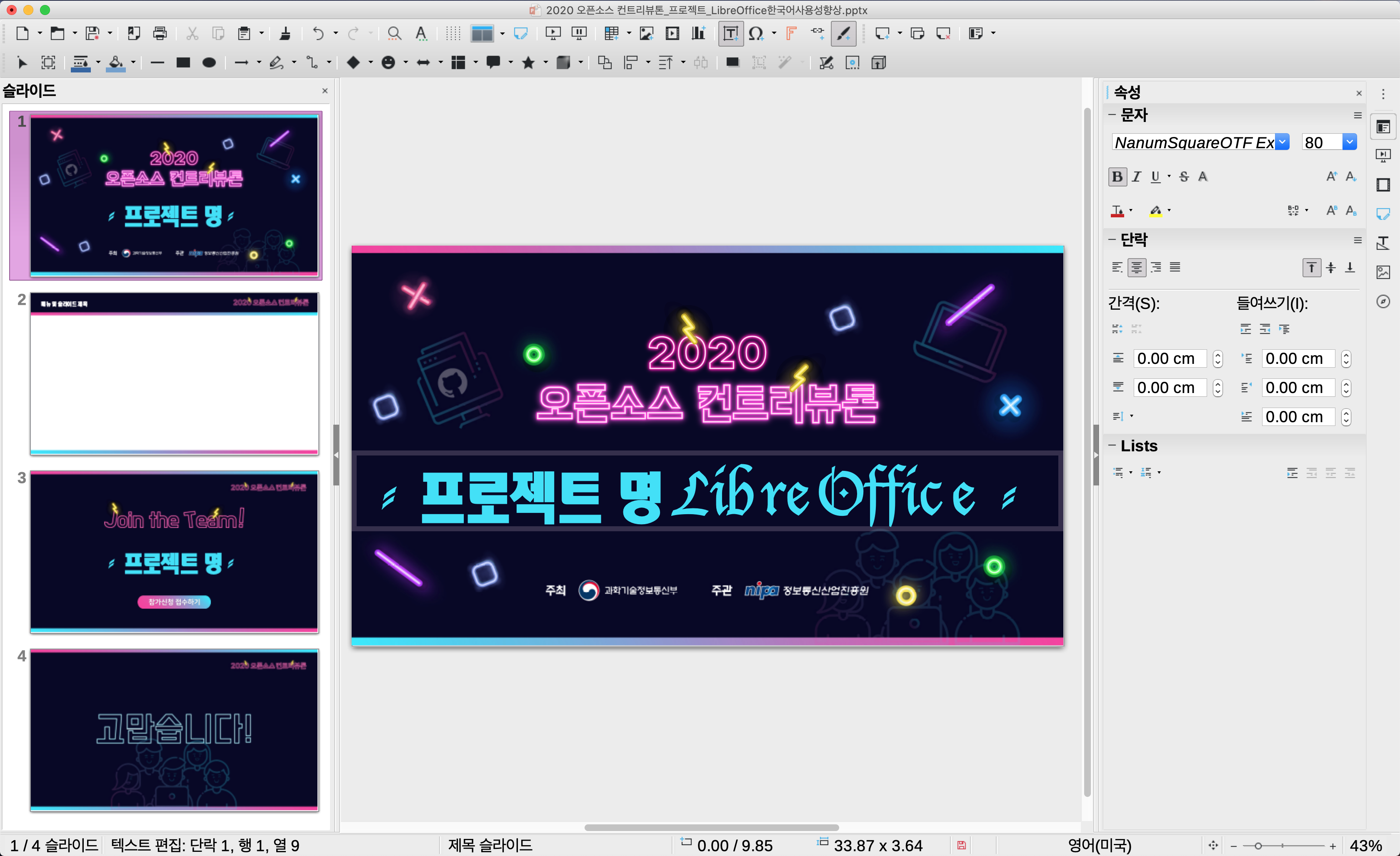 MacOS에서 네이버의 Nanum Square 글꼴 설치 후의 리브레오피스(LibreOffice)의 프로젝트 소개 슬라이드 보기