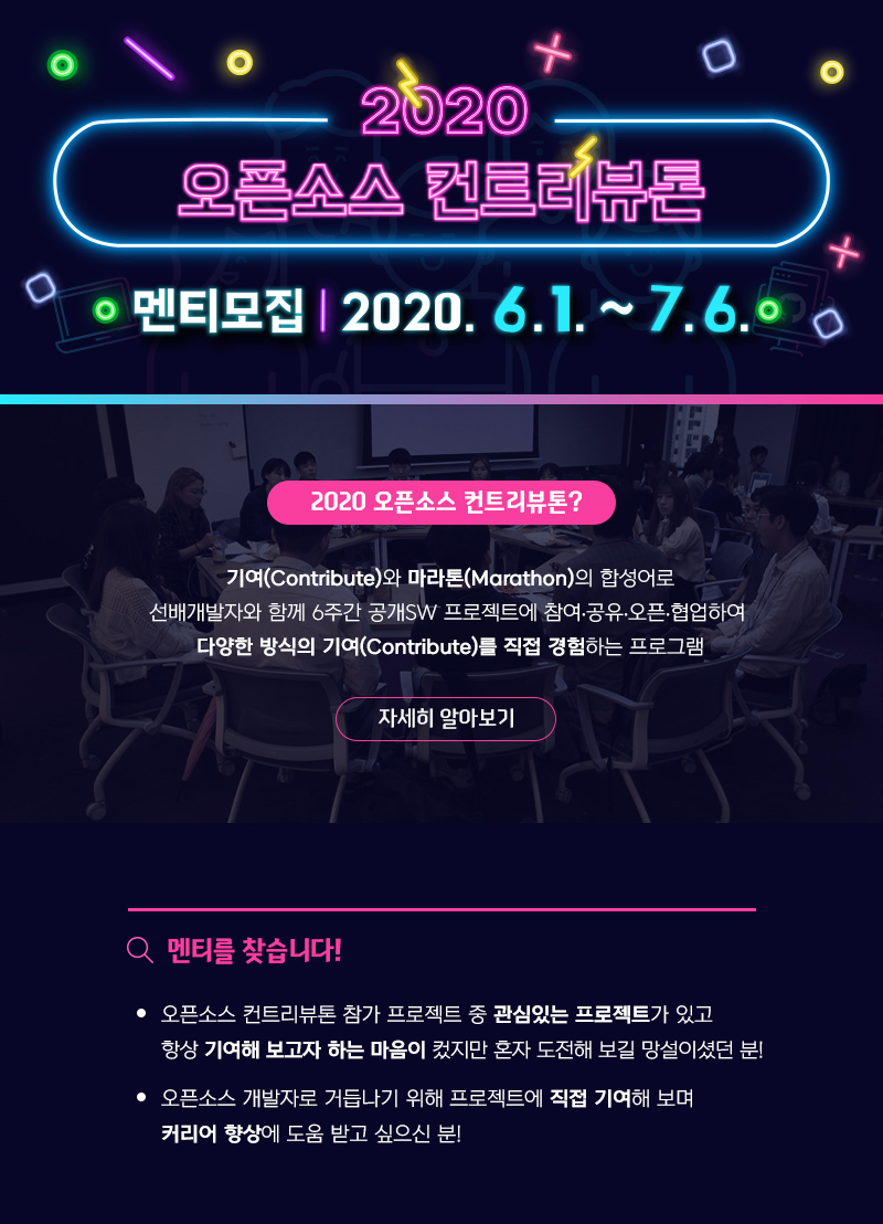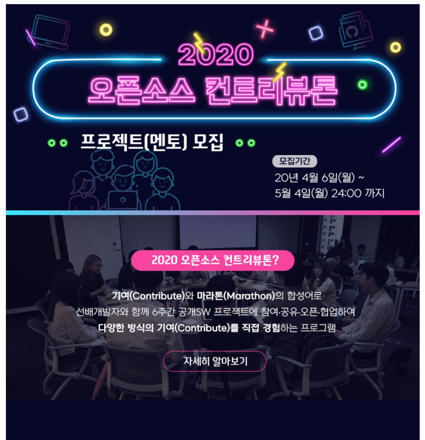 스프린트서울(SprintSeoul) 행사 참여를 하다 보니, 어느 분께서 스프린트 서울 프로젝트 참여하시는 분께서 "2020 오픈소스 컨트리뷰톤" 행사에 멘토로 참여하는 것에 대해서 어떻나는 글을 보았습니다.