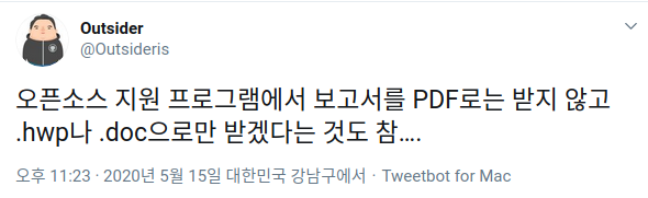 그리고, 혼자서 고민도 안 하고 회사일 하느라 바쁜데 준비과정 없이 신청하였고, 리브레오피스(LibreOffice)로 작성을 하였다 보니 호환성이 안 맞아 내용이 깨져서 주최 측에서 서류 탈락으로 처리하여 떨어질 수 있을 거란 생각을 했습니다.